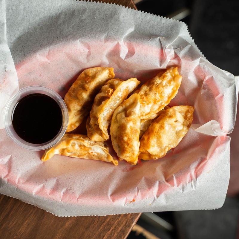 Fried pork and vegetable dumplings served with sriracha soy sauce.